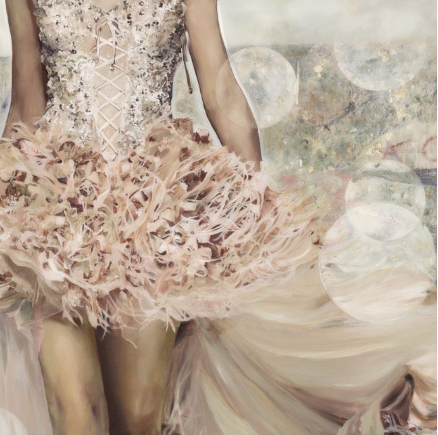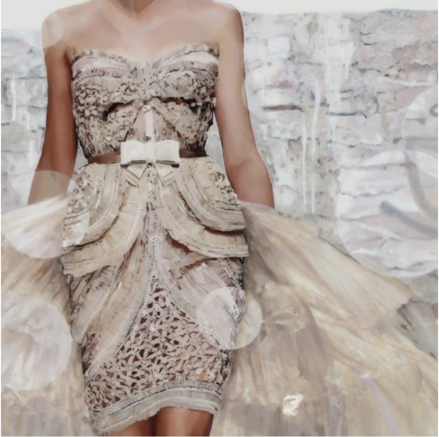 Although many of her design influences date from childhood images, her work owes much to the glammed-up, Hollywood Regency style of shiny surfaces and exaggerated femininity. Certain recent inspirations are more decidedly irreverant or surprising sources, such as the feather-tongued Oscar Wilde, the surrealist Magritte, the street style of Basquiat, and Shakespeare’s Romeo and Juliet.